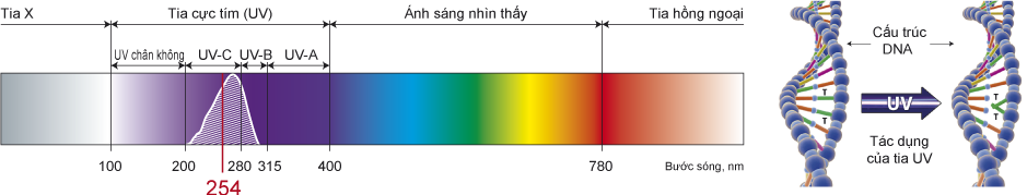 Tia UV có thể khử khuẩn & giết chết vi khuẩn khi chiếu vào, có tác dụng cao nhất trên nuclep Protein của vi khuẩn. Ta có thể khẳng định hiệu quả diệt khuẩn của tia UV tuỳ thuộc vào khả năng chịu đựng của vi khuẩn, ngoài ra nó còn phụ thuộc vào mật độ, thời gian chiếu & điều kiện chiếu …